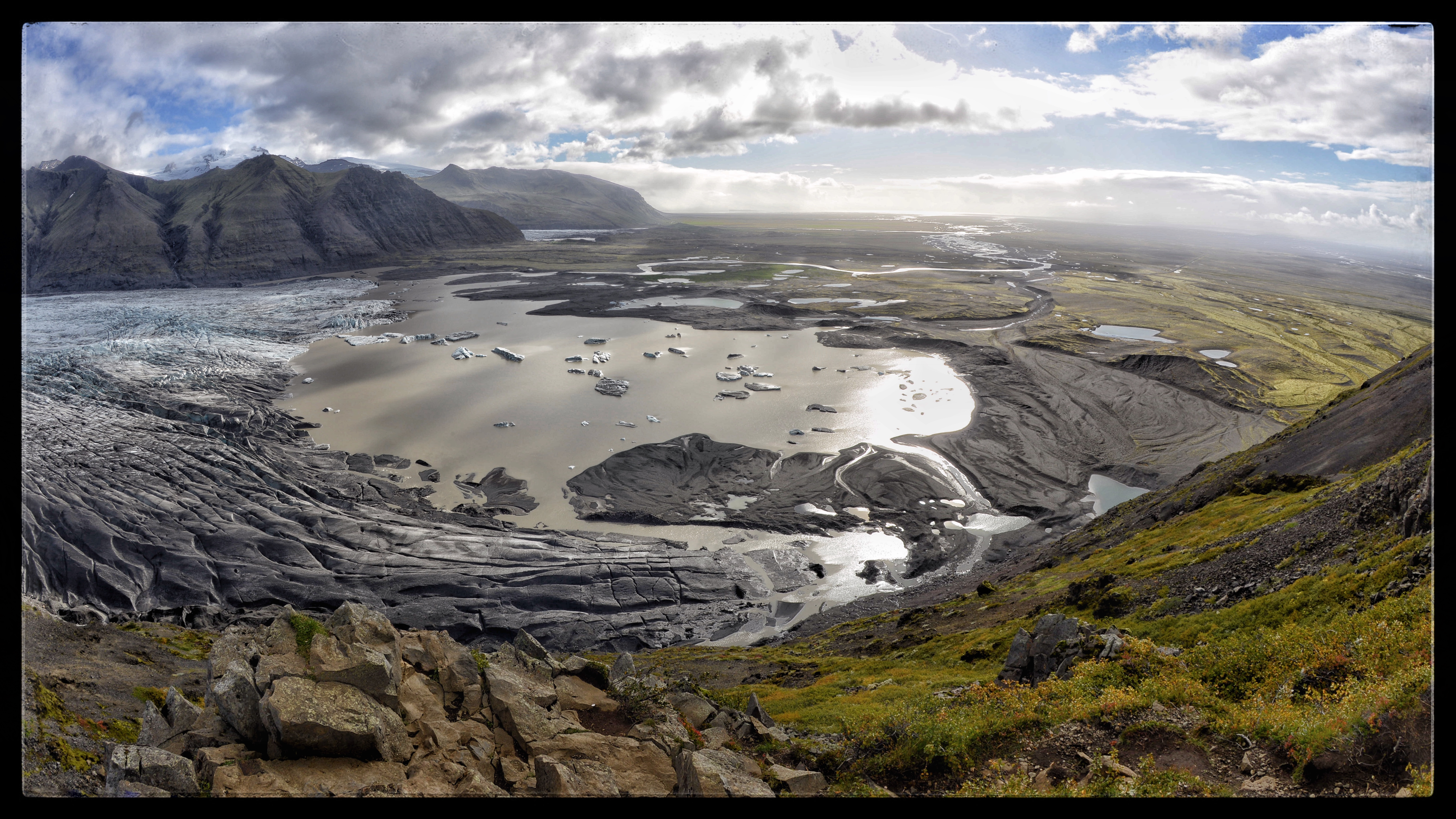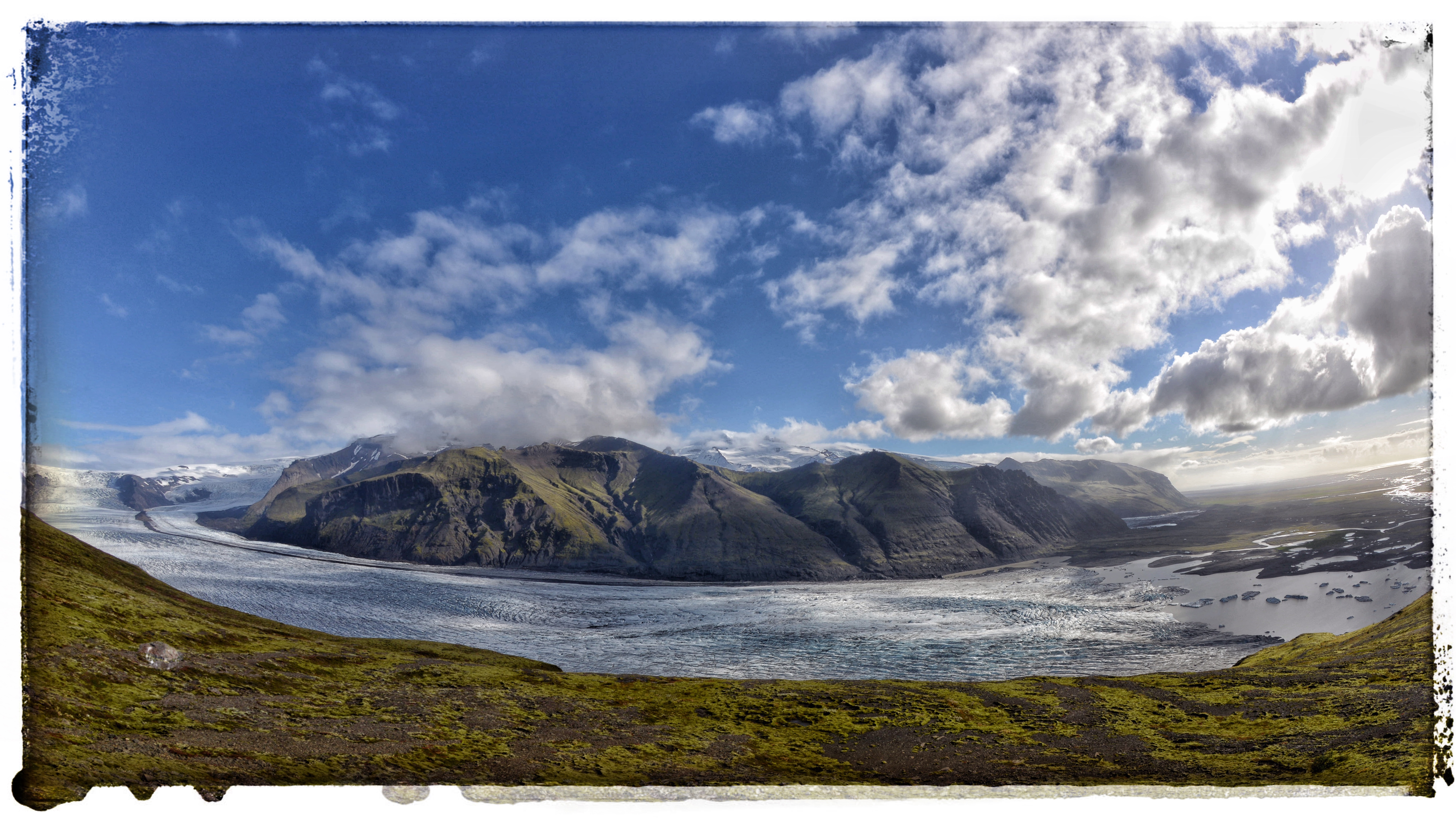 My first night in Iceland, a French woman who has made 26 visits to this country told me about a Norwegian weather site that, according to her Icelandic friends, provides much more accurate forecasts than the Icelandic service. I have been using both of me and honestly haven’t seen much difference – they’ve both forecast fog, clouds, wind and rain, every place that I’ve been. Well, this morning I awoke to more of the same at my cabin. But the Norwegian weather service, unlike the Icelandic one, said it would be partly cloudy becoming sunny at Skaftafell, about 60 miles away and one of the places I really wanted to visit. I took a chance with the Norwegian forecast and lo! A (mostly) sunny day had I! Everything was muddy from all the rain of previous days, but the sun was mostly out and I had beautiful views of Morsájökull, Skaftafellsjökull, Svinisfellsjökull and Öræfajökull glaciers as I wound my way along a ridge between two of them.